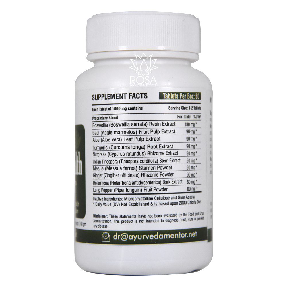 Каждая таблетка по 1000 мг содержит 690 мг стандартизированных растительных экстрактов (Boswellia, Turmeric, Cyperus, Bael Fruit, Aloe vera, Tinsopora and Holarrhena) и 310 мг травяных порошков (Messua, Ginger and Long Pepper).