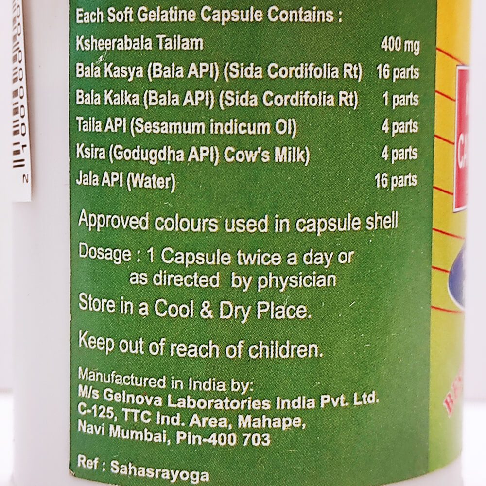 Бала, в виде водного экстракта – кашая (Sida cordifolia), Бала, в виде пасты – калка (Sida cordifolia), Кунжутное масло (Sesamum indicum), Коровье молоко (Cow’s milk). Масло обогащено до потенции 101 (аварти).