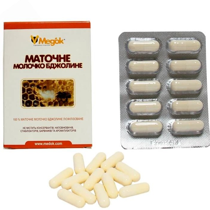1 упаковка содержит 10 капсул по 0,35 г, что соответствует 1 г нативного маточного молочка.