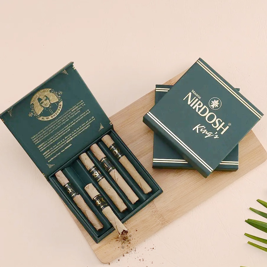 Сигары Nirdosh King’s Herbal свернуты в лист Tendu длиной 95 мм. Благодаря ароматной травяной смеси они предлагают идеальное сочетание травяных и аюрведических преимуществ, специально разработанных для тех, кто хочет перейти от табачных сигар к более здоровой альтернативе.