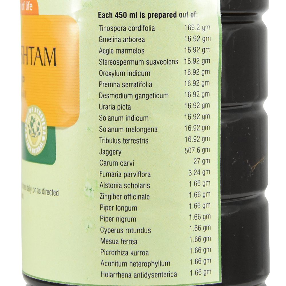 Активные ингредиенты: Гудучи (Tinospora cordifolia), Дашамула (Dashamoola), Эгле мармеладная (Aegle marmelos), Патола (Stereospermum suaveolens), Мезуя железная (Mesua ferrea), Муста (Cyperus rotundus), Ативиша (Aconitum heterophyllum), Пиппали (Piper longum), Имбирь (Zingiber officinale), Мед (Honey), Тростниковый сахар (Saccharum officinarum).