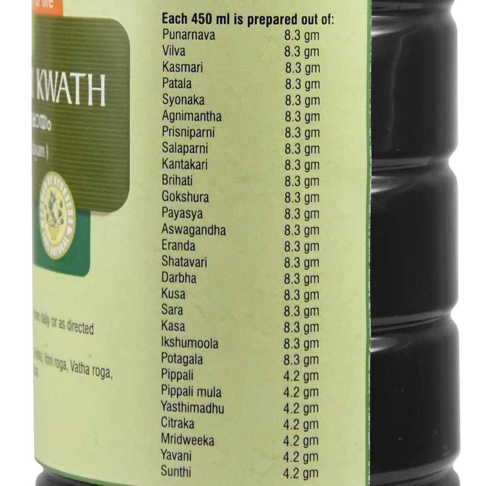 Состав Сукумара кашая (кватха): Пунарнава (Boerhaavia diffusa), Билва (Aegle marmelos), Гамбари (Gmelina arborea), Патола (Stereospermum suaveolens), Шионака (Oroxylum indicum), Агнимантха (Premna corymbosa), Пришнипарни (Desmodium gangeticum), Шалипарни (Pseudarthria viscida), Кантакари (Solanum melongena), Бхадра (Aerua lanata), Гокшура (Tribulus terrestris), Холостема (Holostemma annulare), Ашвагандха (Withania somnifera), Эранда (Ricinus communis), Шатавари (Asparagus racemosus), Дарбха (Desmostachya bipinnata), Куса (Eragrostis cynosuroides), Сахарный тростник дикий (Saccharum spontaneum), Kаса (Imperata cylindrical), Икшумула (Saccharum officinarum (корень сахарного тростника), Потогала (Sphearanthus hirtus), Пиппали (Piper longum), Пиппали (Piper longum – корень), Солодка (Glycyrrhiza glabra), Мридвика, изюм (Vitis vinifera), Явани (Cuminum cyminum), Имбирь (Zingiber officinale).