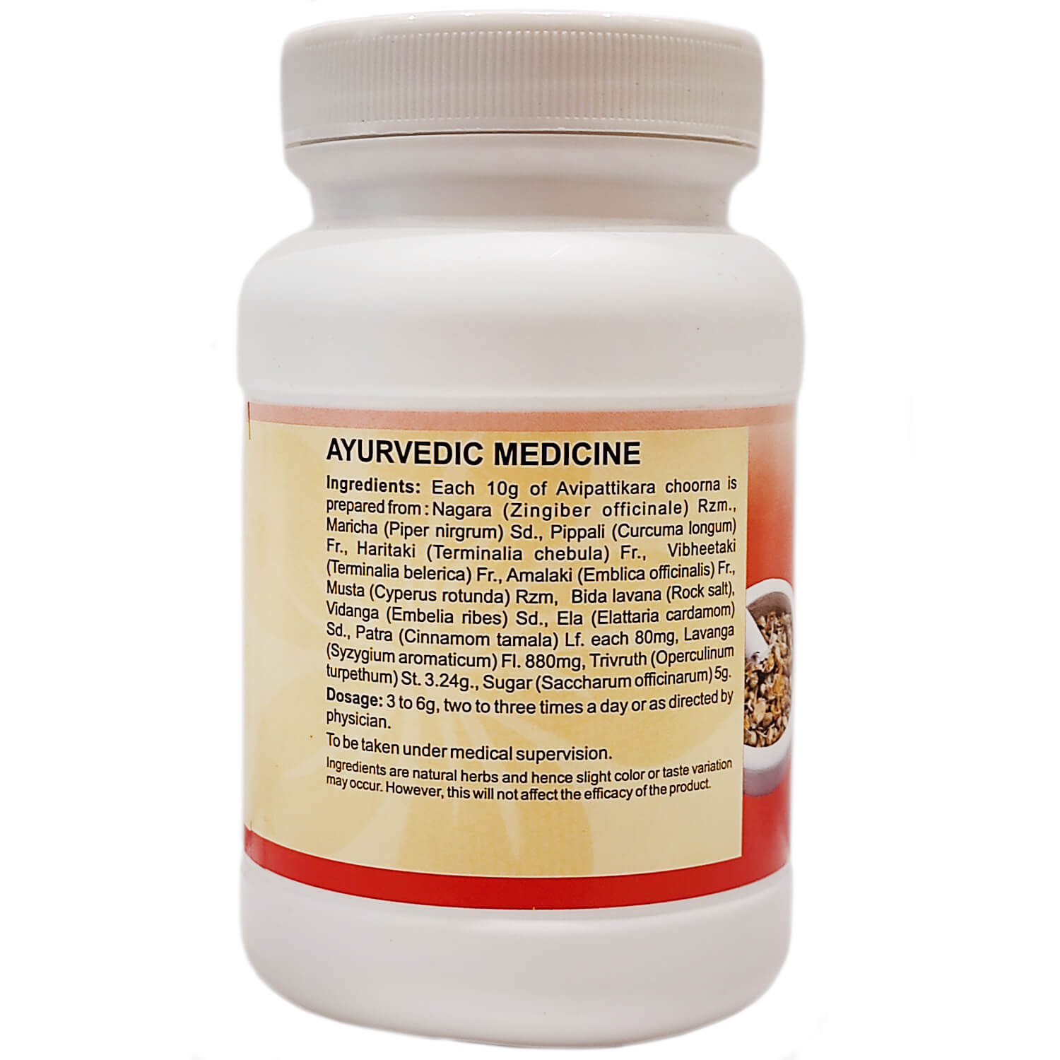 Авипаттикара чурна – традиционная аюрведическая формула в форме травяного порошка (чурна) главными компонентами которой являются травы и специи балансирующие пищеварительный огонь. В переводе с санскрита «а» – означает отрицание, «vipad» – горе, несчастье и «kara» – делающий: травы, устраняющие горе (болезнь).