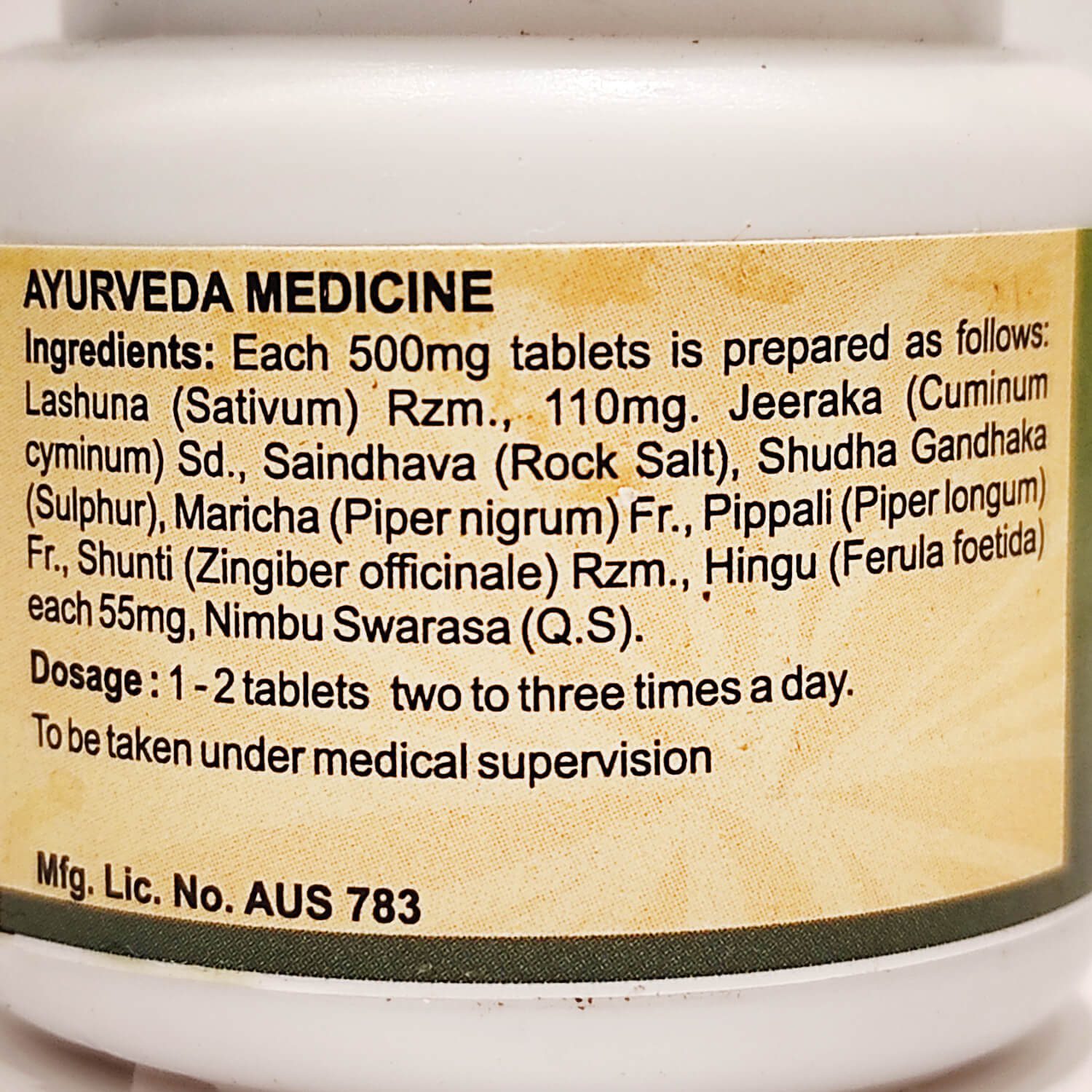 каждая таблетка массой 500 мг содержит Lashuna, Jeeraka, Saidhava, Shudha Gandhaka, Maricha, Pippali, Shunti, Hindu, Nimbu Swarasa.