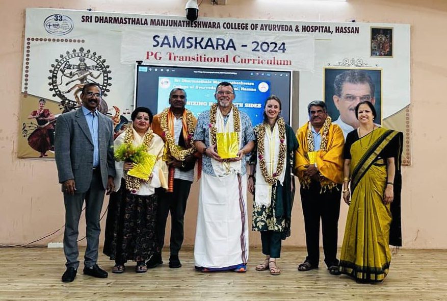 3. Домовленість про якісне онлайн навчання аюрведі студентів з України та Східної Європи. Мабуть, це можна було б поставити на перше місце, але за послідовністю воно було третім. Ми познайомилися з головою наглядової ради 3-х коледжів SDM, паном Dr. P.N. Rao. Це легендарна особистість, яка з містечкової школи аюрведи зробила наймасштабнішу мережу навчання. Очолюваний ним довгі роки коледж SDM у Хассані неодноразово визнавався найкращим в Індії, а діти високопоставлених індійських чиновників, які захотіли освоїти аюрведу, навчаються саме тут. У квітні ми плануємо розпочинати навчання, з здобуттям міжнародно-визнаного диплома та найвищим рівнем знань – чекайте анонсів! Я виступив перед студентами та викладачами коледжу в Хассані та розповів їм про гідні перспективи роботи в Європі.