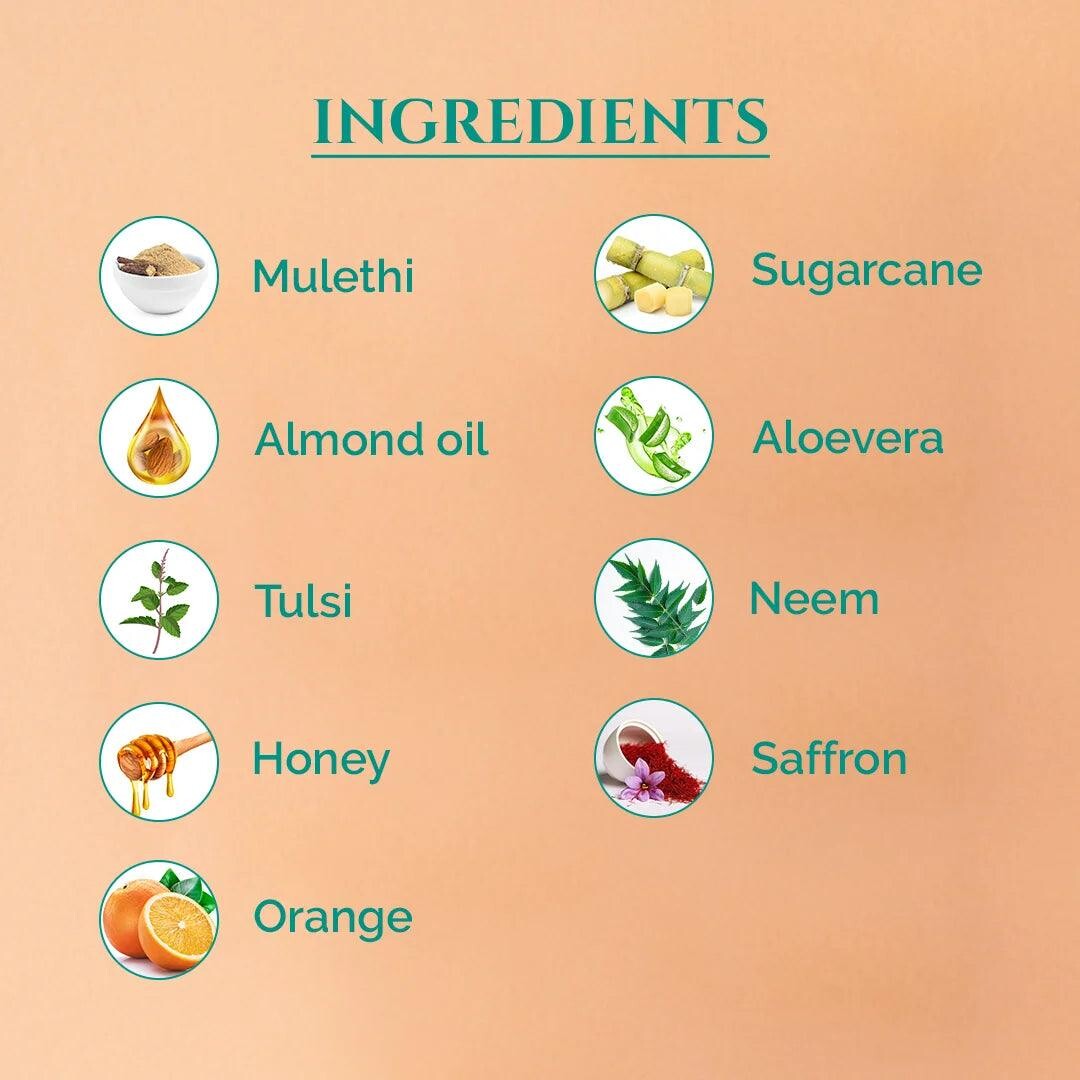 - Освітлює та вирівнює тон шкіри за допомогою шафрану та аюрведичних рослинних компонентів;