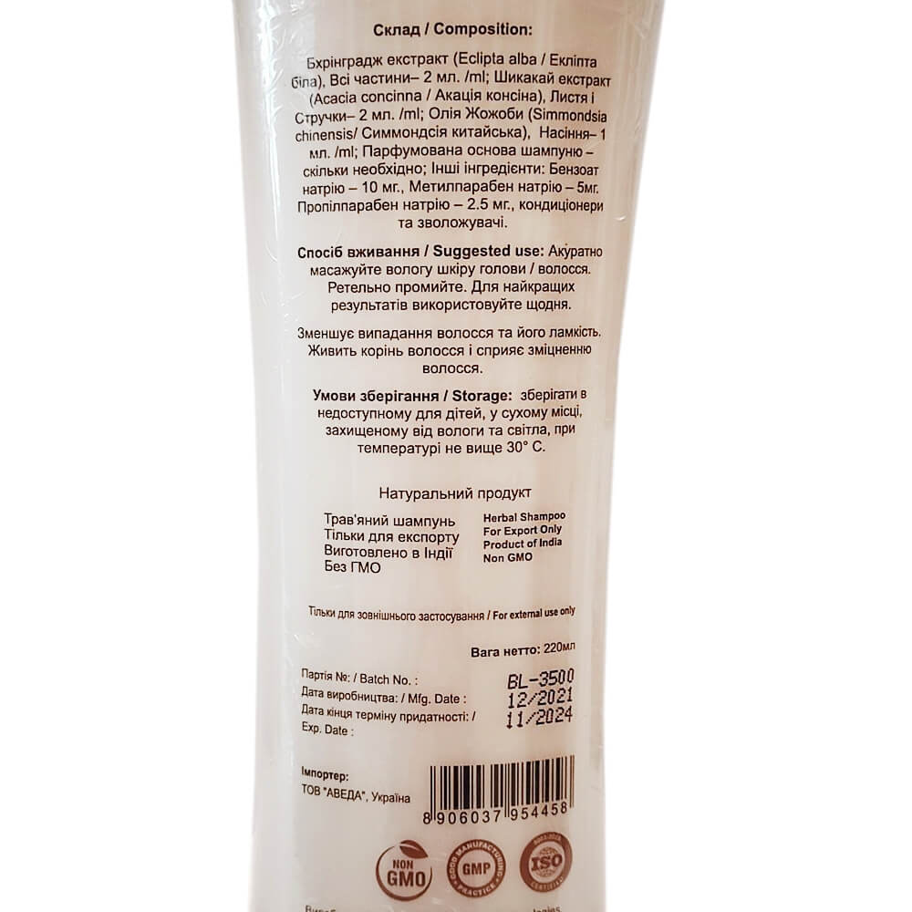 Трав’яний шампунь Бхринградж і Шикакай дбає не тільки про Ваше волосся, а й про шкіру голови. Шампунь дбайливо очищає та зміцнює волосся по всій довжині, а також оздоровлює та насичує клітини епідермісу вітамінами та мікроелементами. Шампунь Брінгарадж Шикакай стимулюючи мікроциркуляцію кровотоку шкіри голови та тонізуючи її він вирішує більшість проблем з волоссям та шкірою голови: лупа, випадання, свербіж, почуття стягнутості, роздратування.