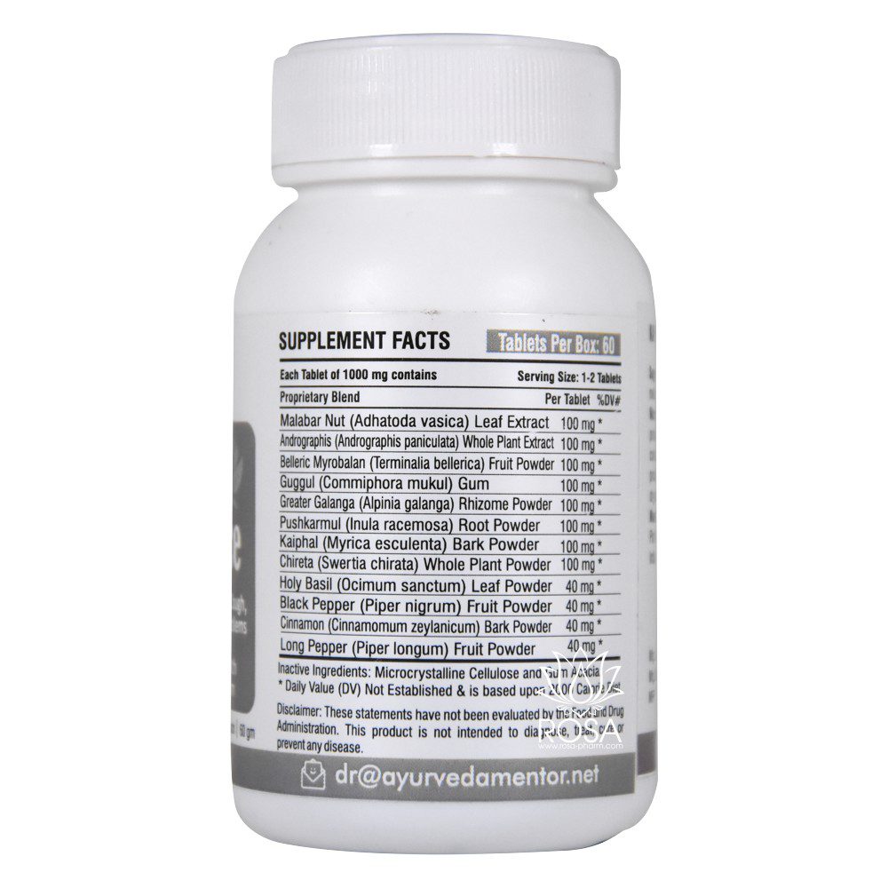 Malabar Nut, Andrographis, Guggul and Belleric Myrobalan, Greater Galangal, Pushkarmul, Kaiphal, Chireta, Holy Basil, Black Pepper, Cinnamon and Long pepper.