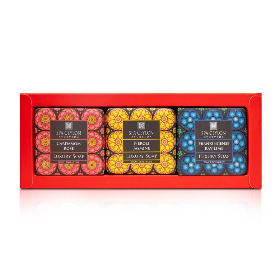 У набір входить: Люкс мило Кардамон троянда 50г, Люкс мило Неролі Жасмин 50г, Люкс мило Ладан та Лайм 50г.