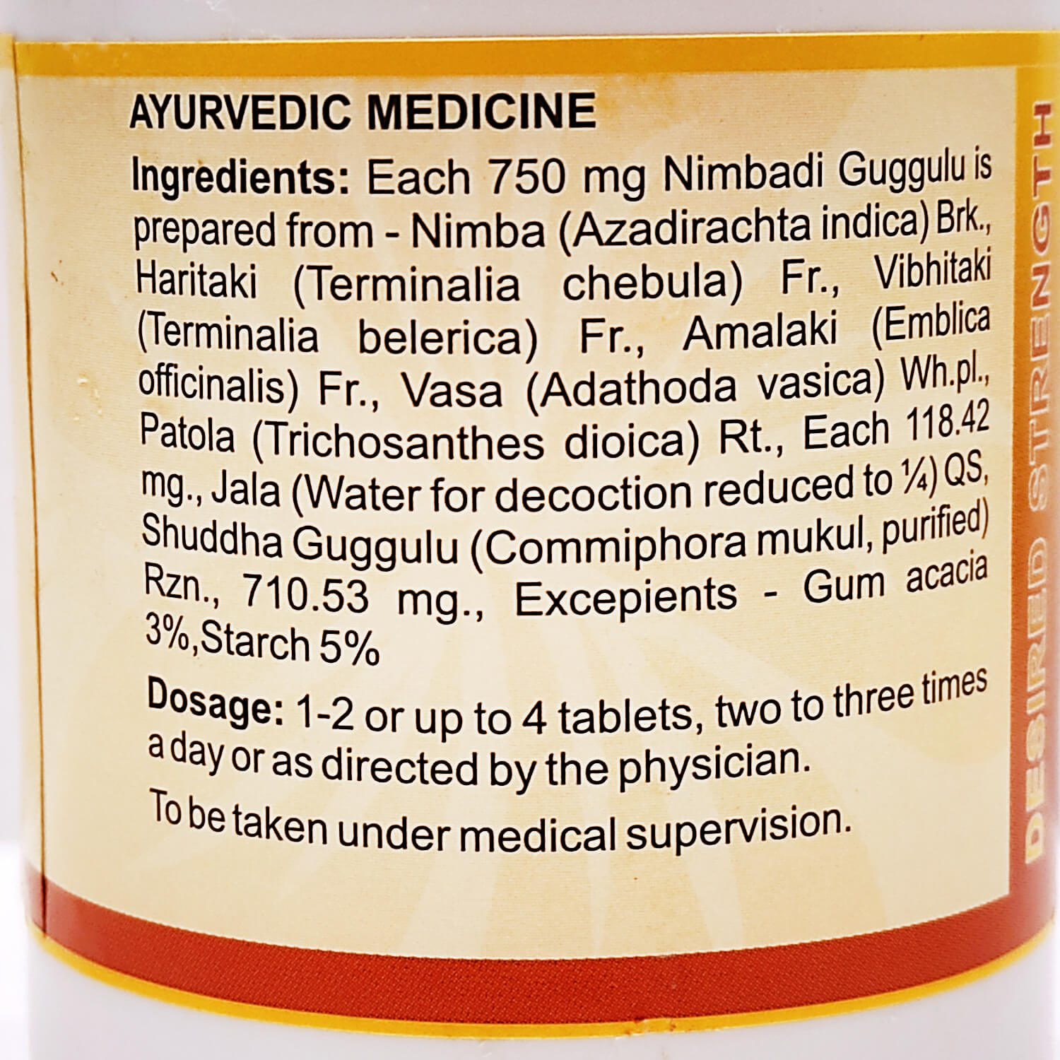 Склад Німбаді гуггул: Нім (Azadirachta indica), Гуггул (Commiphora mukul), Амла (Emblica officinalis), Харітакі (Terminalia chebula), Бібхітакі (Terminalia belerica), Піппалі (Piper longum), Імбир (Zingiber officinale), Бріхат (Solanum indicum ), Бхунімба (Andrographis paniculata), Пушкарамула (Inula racemose), Кедр Гімалайський (Cedrus deodara), Гудучі (Tinospora cordifolia), Гедіхіум (Hedychium spicatum), Сціндаптус (Scindapsus officinalis).